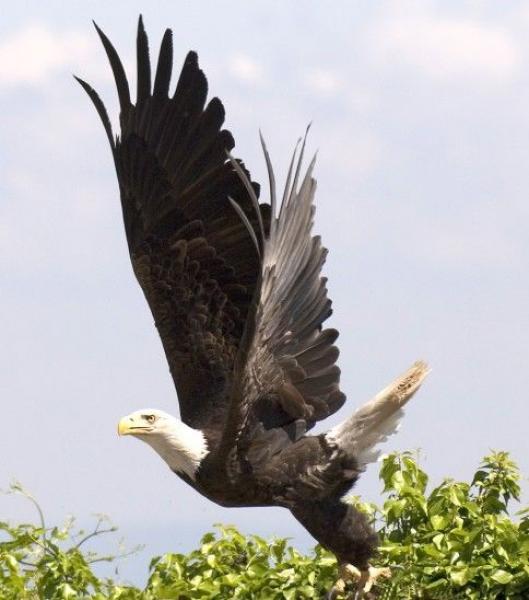 Soudain, un autre encore, qui s'était perché à la cime d'un grand arbre, descend en piqué à la vitesse d'un projectile, les ailes à demi repliées, puis freinant sa course au dernier moment par un vol battu vient se poser sur le gant du dresseur.